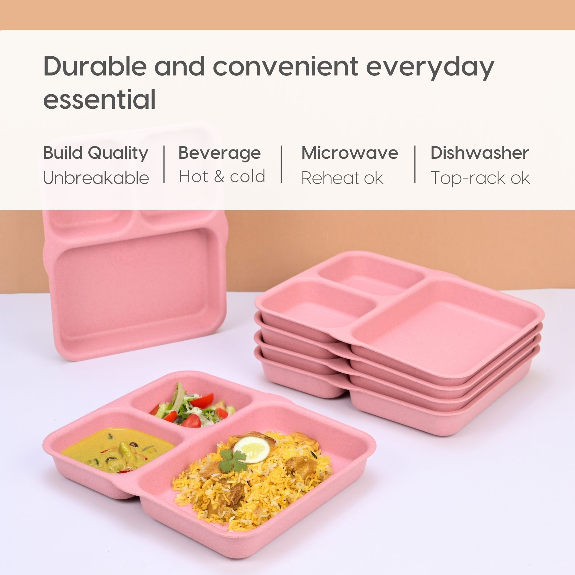 Eco-Friendly – Realizate din fibre de bambus refolosite, coaja de orez si legaturi sigure pentru alimente. Pot fi reciclate la finalul utilizarii, sustinand economia circulara, de la design la sfarsitul ciclului de viata. Astfel, contribuie la conservarea resurselor naturale.